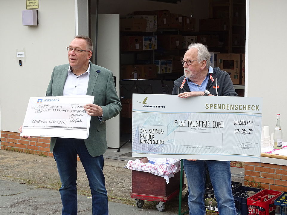Bürgermeister Oelmann betonte die Wichtigkeit der Kleiderkammer. Er sagte, dass es, obwohl es eigentlich in so einem Land wie Deutschland nicht sein dürfte, Menschen gibt, die nicht so gut gestellt sind und denen finanziell geholfen werden muss, auch in Winsen. Dabei ist eine Kleiderkammer hilfreich und muss auch von der Gemeinde in ihrer Arbeit unterstützt werden. Von beiden Seiten bekam der DRK Ortsverein Winsen (Aller) e.V. deshalb 5.000 € gespendet.